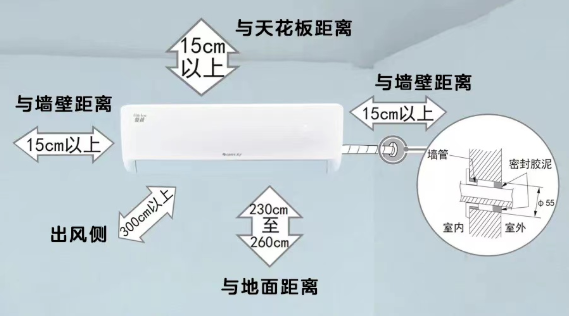 空调内机回风口与室外空间的距离决定了运行效果。回风距离过近会导致回风量不足,制冷效果差。内机与天花板距离宜在15cm以上,距离墙壁12cm以上,距离地面230-260cm最佳。确保进出口畅通无阻,让送风无障碍!